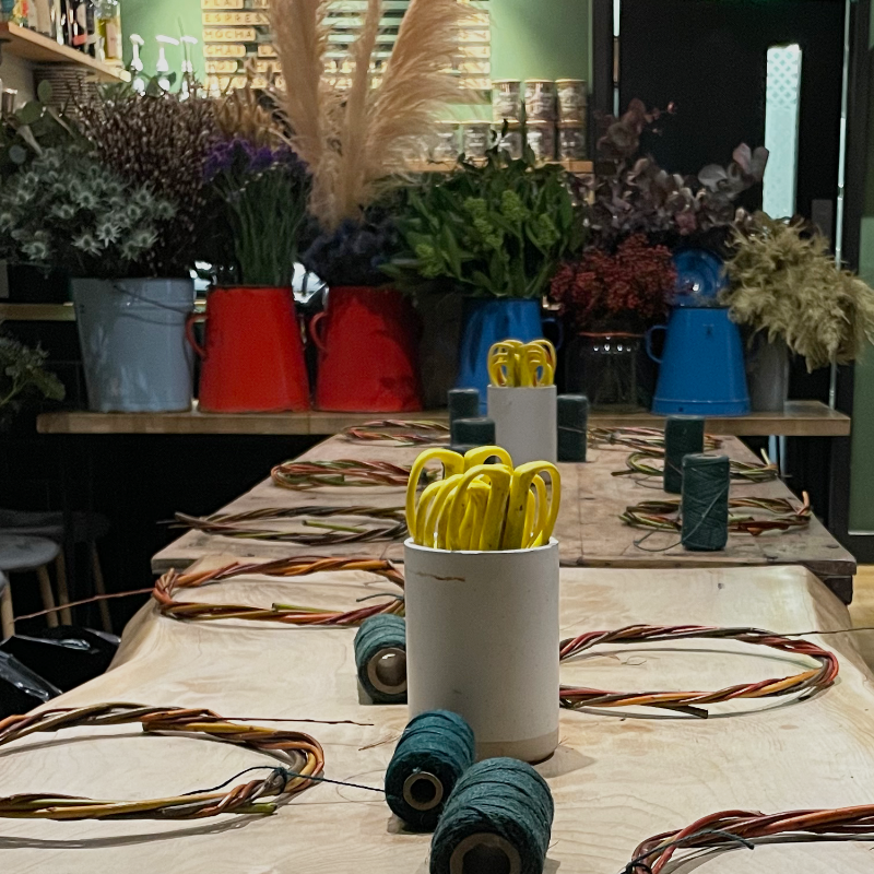 The total cost includes all equipment & materials, homemade festive nibbles, tea/coffee, mocktails, mulled wine and of course, lots of fun! At the end of your workshop everyone will have a beautiful hand made Christmas door wreath to take home.